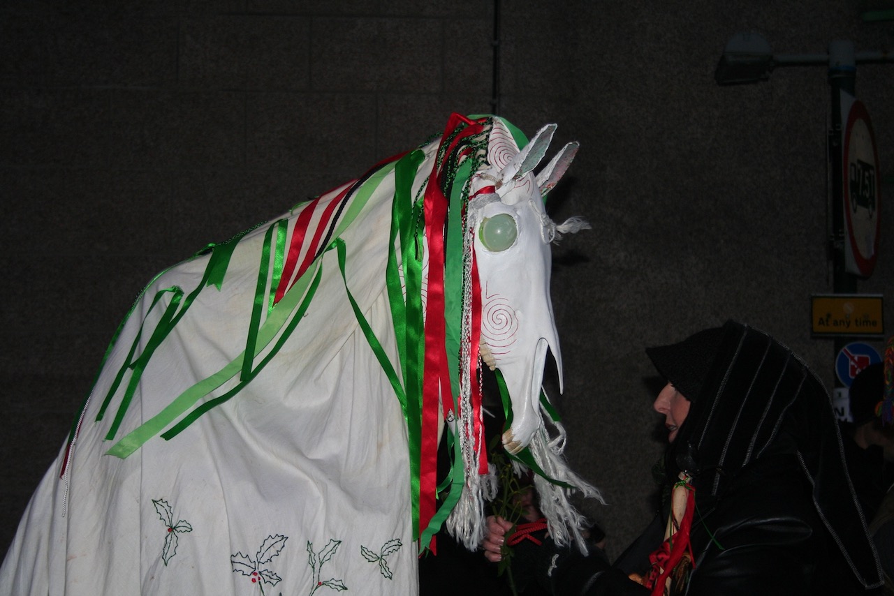 The Mari Lwyd is an ancient Welsh custom which used to be widespread, almost disappeared  to survive only in a few places and is again regaining popularity in the twenty-first c century, At Llangynwyd it has survived (with perhaps a very short break) whereas in other locations it is usually a revival of a dormant custom. Mari Lwyd means grey mare, and she takes the form of a decorated horse-skull on a pole operated by a man in a white sheet ; the Mari would be paraded around the district in return for refreshment as a house-visiting custom. A feature of the event was the singing battle between the visiting party and householders, followed by the visitors being invited in for cake. Nowadays the action takes place at the Corner House pub and the singing is still a feature of this event.