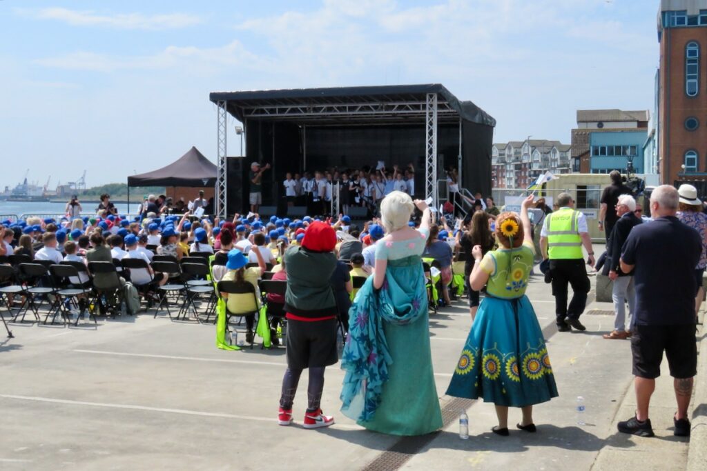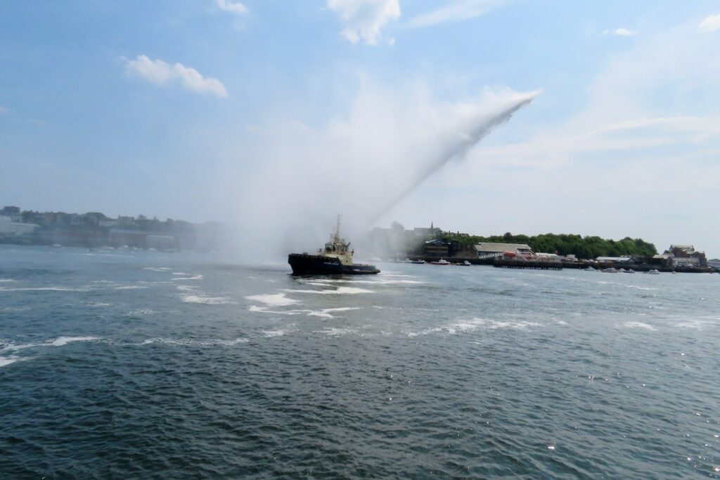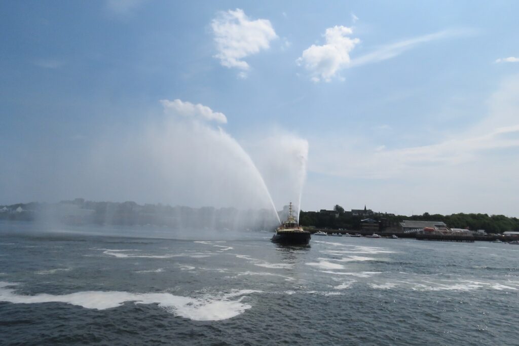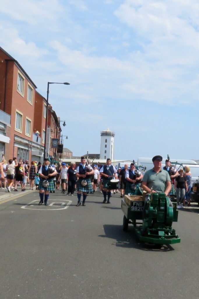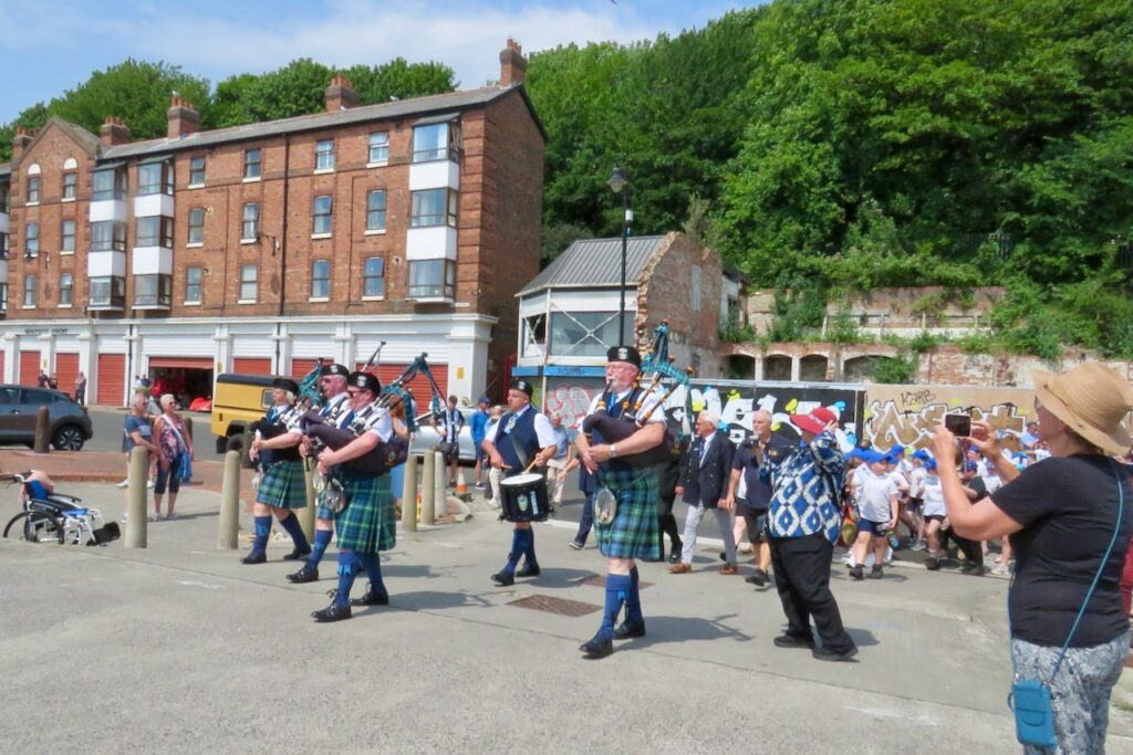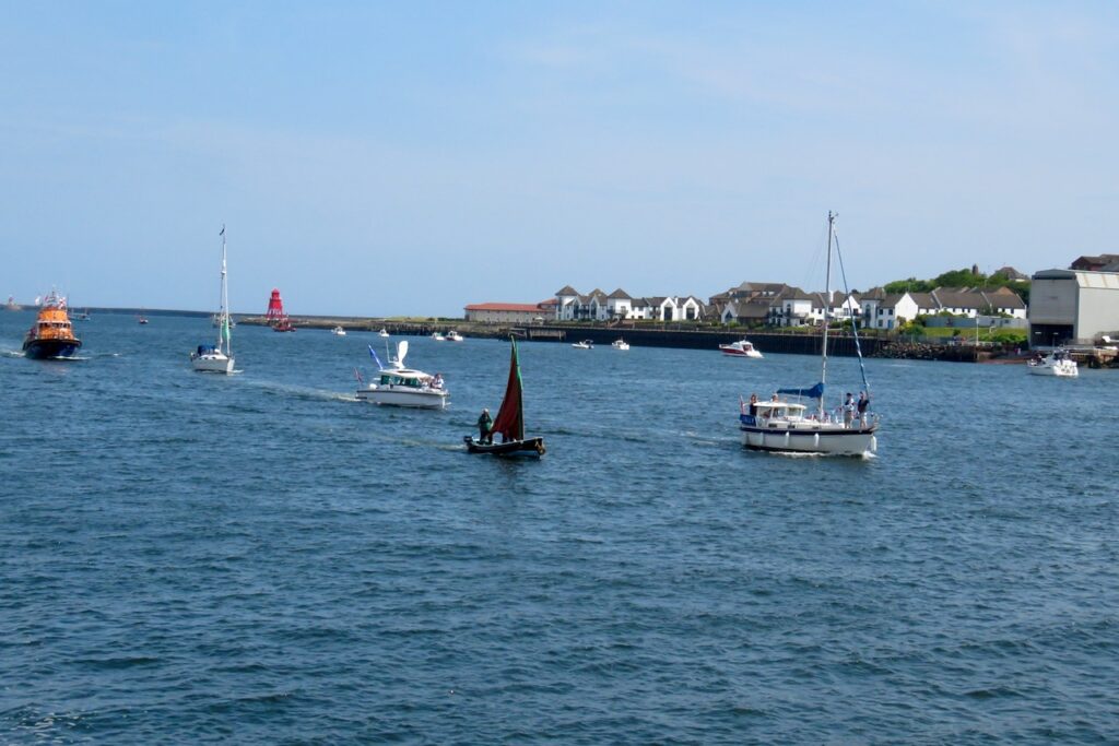Blessing the Sea was a calendar custom which formerly took place on Rogation Monday at the fishing port of North Shields. In modern times it moved date to become part of the annual Fish Quay Festival on Spring Bank Holiday weekend but since the festival no longer takes place, the Blessing has also ceased as an annual event. However, when there are special occasions in the town the Blessing is sometimes incorporated into them as it has a long history and is regarded as an important part of the ancient port’s heritage. In 2025 North Shields had a year-long North Shields 800 celebration to mark the octocentenary of the foundation of the town and fishing port on the Tyne, and the Fishermen’s Heritage Project and Mission organised the Blessing and the Parade of Boats along with other organisations, the Council and local dignitaries. The Blessing of the Fleet was part of a large midsummer event featuring musical performances by local schoolchildren beside the Herring Girl statue on the quay, after a parade of over 300 pupils through the streets led by a Pipe Band and a popper truck, and followed by the Parade of Boats on the Tyne in which a variety of craft participated including the Svitzer tug which gave the crowd a water jets display (and a squirt over the assembled spectators at the end!).