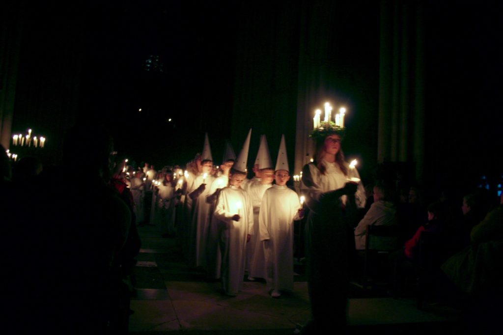 A number of churches in the UK host Sankta Lucia services, particularly in towns which have current or historical associations with Sweden or Norway; they’re often held on a day near December 13th rather than on the date itself. The services are a relatively recent occurrence in the UK, dating in the main to the 21st century, though following ancient Swedish precedent. Click the links below to find out more.