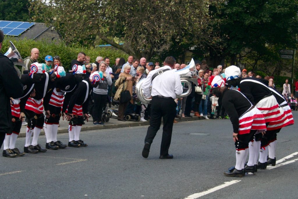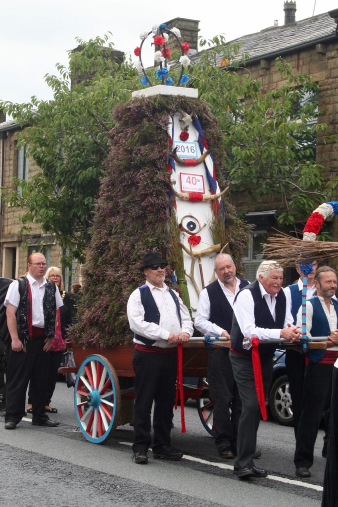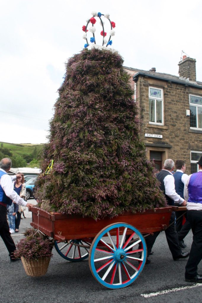 Whitworth Rushcart is one of a clutch of customs in the North West involving a large wheeled vehicle covered in rushes and flowers accompanied by morris dancers and music as it perambulates the locality – what makes this event unique is that the decoration is based on heather grown on the moors nearby. The origins of the Rushcart are similar to the tradition of rushbearing which survives in Cumbia, but which have evolved in a different way. Rushes were gathered for strewing on the church floor and a boundary-walking processional element was common. The Rushbearing at Whitworth was revived in the twentyfirst century after a long break and is now a well established part of the local calendar. On the second Sunday in September the cart is paraded through town by Whitworth Rushcart Dancers with a brass band accompaniment, before morris dancing at the carpark by the Civic Hall. At the end of the procession you can buy bunches of lucky heather from the basket at the back of the cart. There are stalls and entertainments at the carpark, after which the Rushcart Dancers host a music session at the Band Club. The event is organised by the Whitworth Council’s Tourism & Leisure Committee.